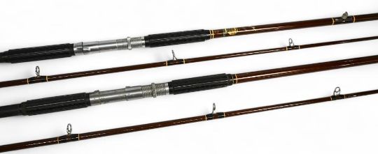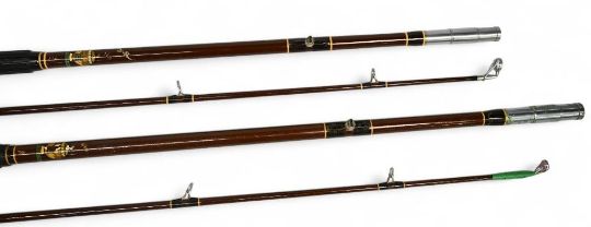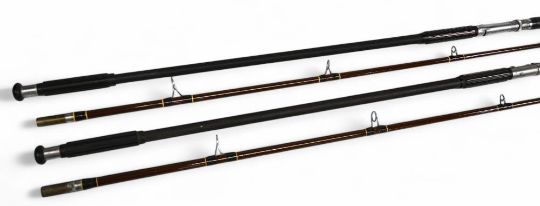 A pair of Hardy "Longbow" beach caster rods: 12ft 2pc, 4-6oz; 12ft 6" 2pc, 6-8oz - with rubber grips, alloy down locking reel seats and lined rings, in MCBs. Both with light use (2)