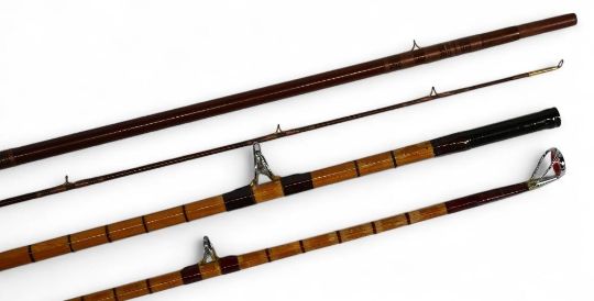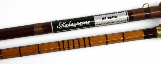 Shakespeare Fly-Master No 1604 hollow glass trout fly rod, 9ft 2pc line 8#, alloy double down locking reel seat, MCB. Unnamed split cane boat rod 9ft 6" 2pc, 21" handle with alloy sliding reel fittings, lined rings, cloth bag. Very light use. (2)