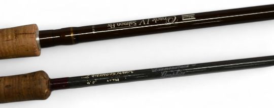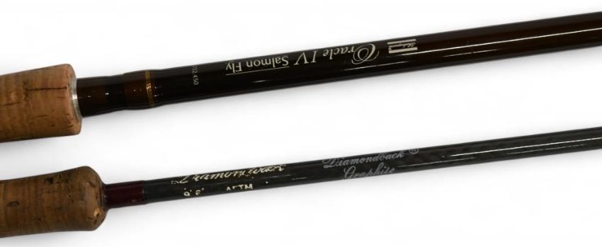 Shakespeare Oracle IV salmon carbon fly rod No 1732-450, 4.5m 4pc line 10/11#, 27" handle, down locking reel seat, lined butt/tip rings, cloth bag. Diamond back graphite trout fly rod 9ft 6" 2pc line 6#, alloy uplocking reel seat, lined butt ring, no bag. (2)