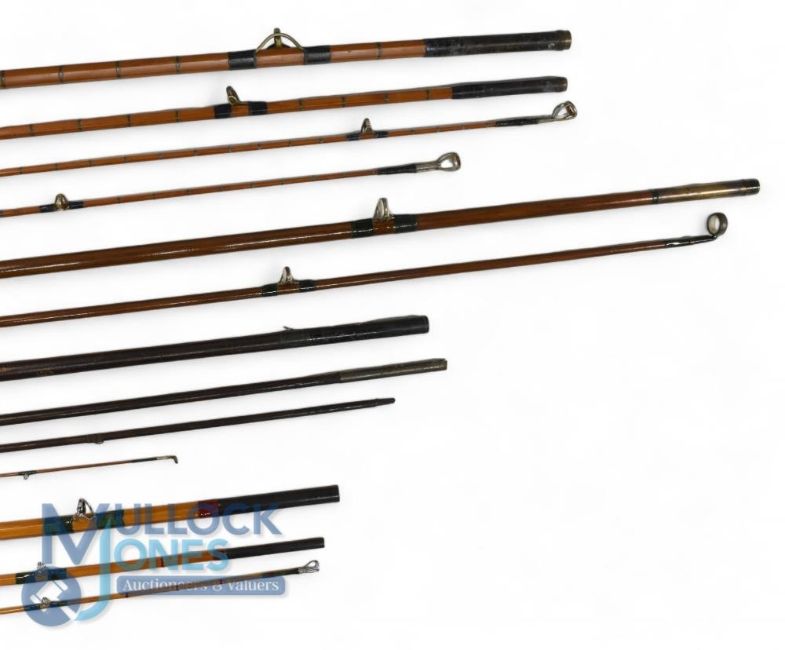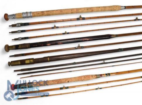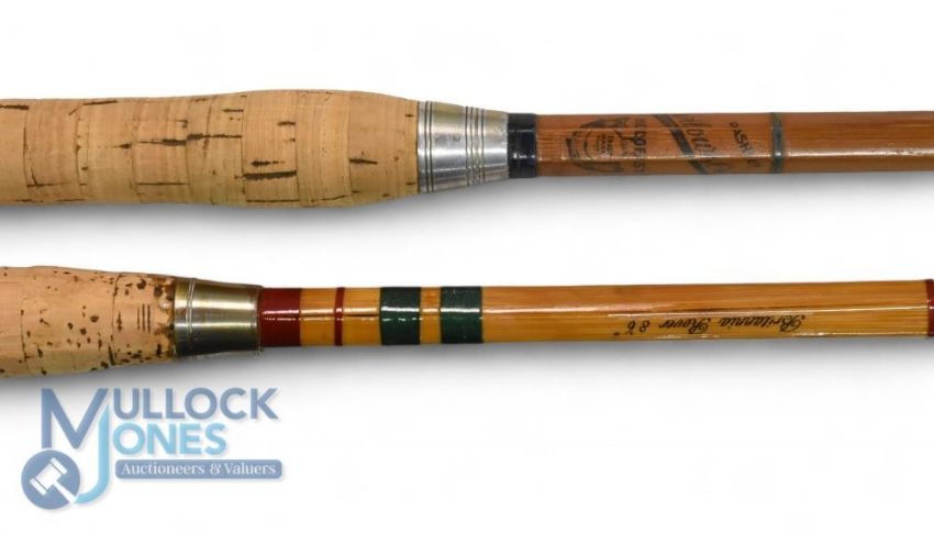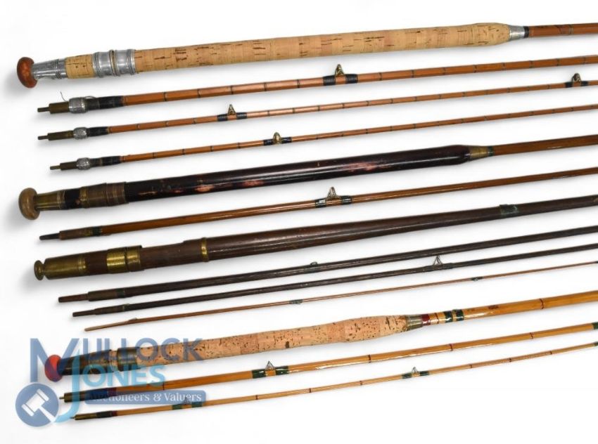 Farlow of London Holdfast Pashley, 11' 3 piece split cane spinning rod with spare short tip, agate lined guides, one distorted, Patent screw lock fast ferrules, cork handle; a Britannia 8'6", 3 piece split cane spinning rod, refurbished, repair to tip; a Victorian greenheart 8' 2 piece spinning rod, ceramic guides, cedar handle, bronze ferrules, 3/4n Edmonston of Liverpool 9' 4 piece greenheart drop ring rod, with 1871 engraving to butt, damaged mid-section, spare/repairs. (4)