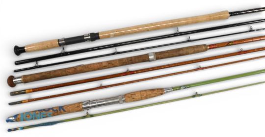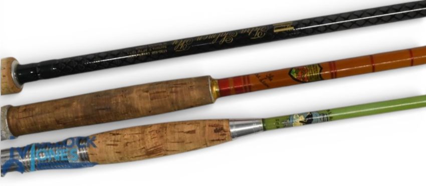 Shakespeare Tetra carbon salmon fly rod No 1730-420, 4.2m 3pc line 10/11#, 28" handle, down locking reel set, lined rings throughout. MCB, looks unused, plastic still on handle. The Trossachs Rod Building Co, a Clan Rod "The MacLean" split cane salmon fly rod, 13ft 6" 3pc, 24" handle with alloy sliding reel fitting, red agate butt/tip rings, cloth bag. A Black Seal solid glass spinning rod, 6ft 6" 2pc with 18" handle, alloy down locking reel set and collars, lined rings throughout, cloth bag. Light use. (3)
