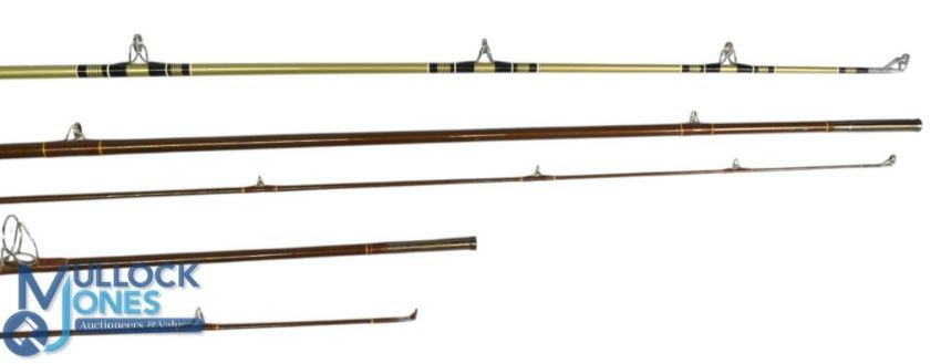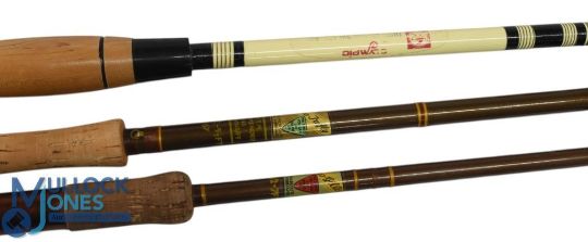 Milbro Scotland Trufly hollow glass trout fly rod F8/2, 9ft 6" 2pc line 6#, alloy down locking reel seat, lined butt/tip ring, MCB. Light use. Milbro Scotland Gillie hollow glass spinning rod F71/2, 7ft 2pc, 14" handle, alloy uplocking reel seat, MCB. Olympic Japan solid glass sea boat rod, 6ft 6" 2pc including handle, 26" wood handle, double alloy uplocking reel seat, lined rings, cloth bag. Light use (3)