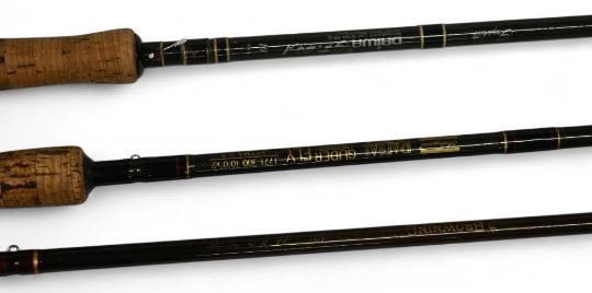 Daiwa Graphite GT-49A carbon trout fly rod, 10ft 2pc line 9/10#, alloy reel seat, lined rings, in Silver Fin hard tube. Shakespeare Radial Glider carbon trout fly rod 1771-300, 10ft 2pc line 7/9#, down locking reel seat, lined rings, cloth bag. Browning Boron 1500 BF 1008 carbon trout fly rod, 10ft 2pc line 8/9#, alloy reel seat, lined rings, cloth bag. (3)