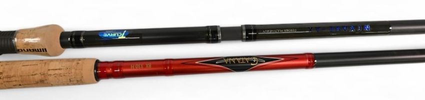 Fine Shimano Nexave AX feeder multi heavy carbon combination rod 12-14ft with 3x tip sections 2oz/3oz/4oz, 24" handle, plastic wrap on handle, down locking reel seat, lined rings throughout, MCB, plus Shimano Catana BX 330H 3.3m 2pc casting wt 20-50g MCB light use (2)