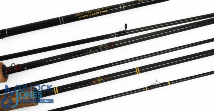 Unnamed Deluxe carbon trout fly rod 110ft 2pc line 6/8#, alloy uplocking reel seat with wood insert, lined rings, cloth bag. Sydney Jarvis Redditch carbon trout fly rod 9ft 2pc, double uplocking alloy reel seat, lined butt/tip rings, cloth bag. Bob Church & Co The All Rounder carbon trout fly rod 10ft 6" 2pc, line 6/10#, double alloy uplocking reel seat, lined rings, cloth bag. (3)