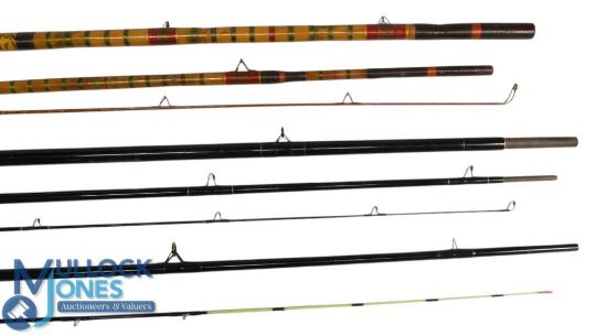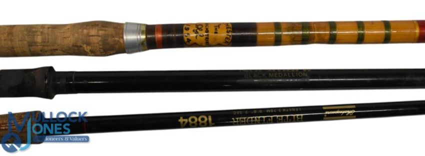 Normark Black Medallion BMM 1563 hollow glass float rod, 13ft 3pc, 26" composite handle, alloy sliding reel fittings, cloth bag. Shakespeare Bite Finder 1884 hollow glass rod, 9ft 2pc, 20" handle, alloy reel fittings, MCB. One for restoration - Chester "The Quick Silver" float rod, Spanish Reed with split cane spliced tip, 13ft 3pc, 25" handle, alloy reel fittings, cloth bag (several missing rings). (3)