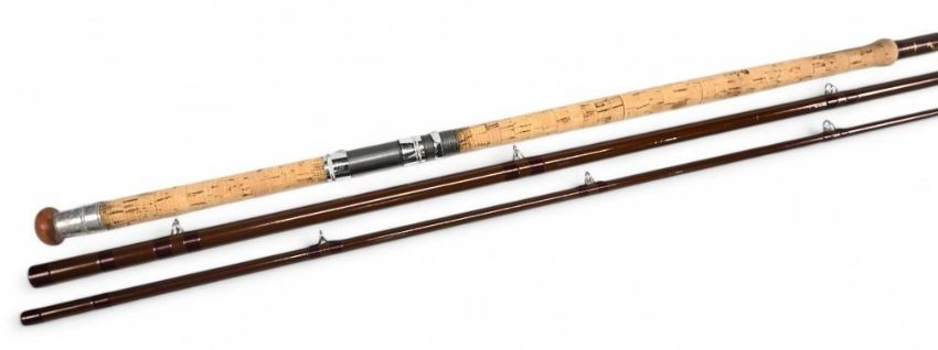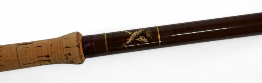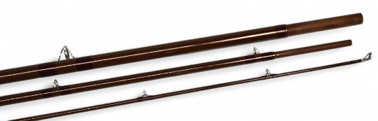 Bruce & Walker "Expert" hollow glass salmon fly rod, 14ft 3pc line 9/11#, 30" handle, down locking reel seat, red agate butt/tip rings, cloth bag. Light use