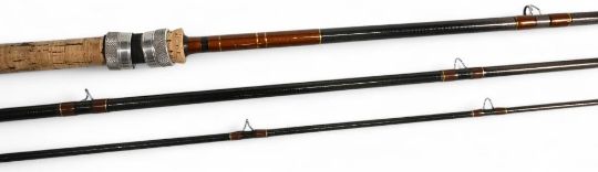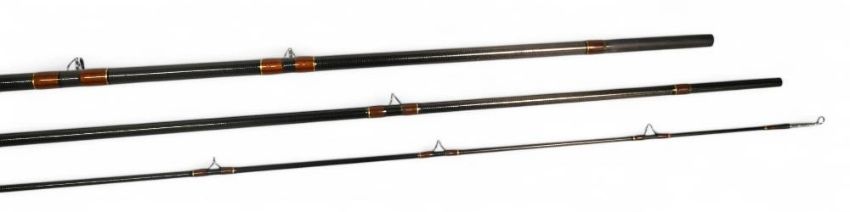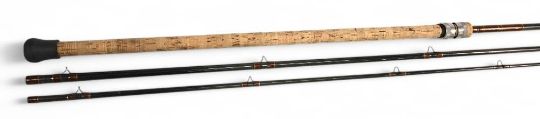 Unnamed 15' 3 piece graphite coil salmon fly rod, slim quality blank, whipped bronze, tipped gold, 29" cork handle with sliding reel rings, in Shimano cloth bag.