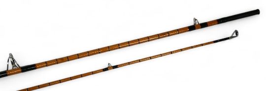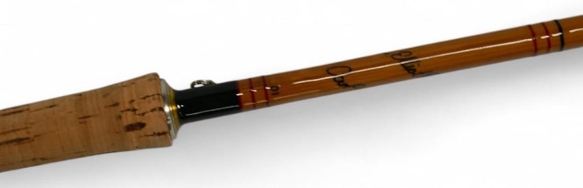 Paul Elliott Rods one-off experimental split cane carp rod 9ft 2" 2pc with 1.75 test, 26" handle with polished alloy sliding reel fittings and collars, red agate lined butt/tip rings, cloth bag. Looks unused, very nice