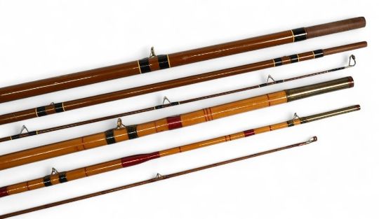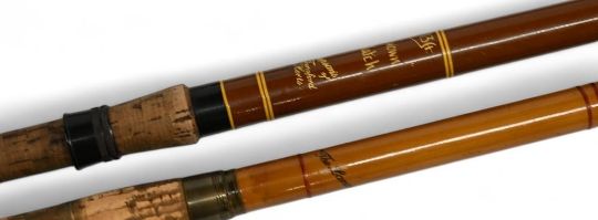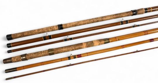 S Allcock & Son Redditch "The Lancer" whole cane match/float rod with spliced greenheart mid/tip section, 18" handle with brass sliding reel fittings and collars, stand off rings with red agate butt/tip and MCB. Simpsons of Turnford Herts "Crown Match" hollow glass match/float rod, 13ft 3pc, 26" handle, alloy sliding reel fittings, stand off rings with red agate butt/tip rings and cloth bag. (2)