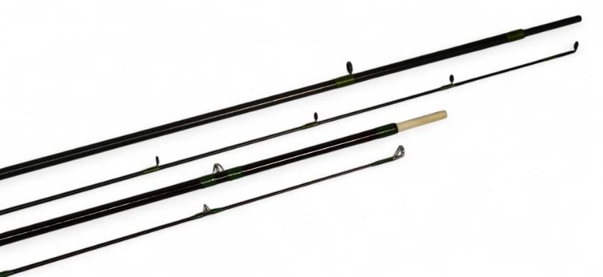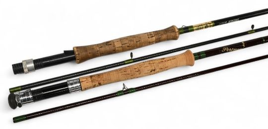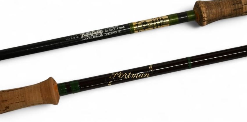 Portman hollow glass trout fly rod, 8ft 6" 2pc line 6#, alloy uplocking reel seat, agate lined butt/tip rings, East Anglian Rod Company cloth bag. Very light use. Fibatube Alnwick graphite carbon trout fly rod No 8/9/1C, 9ft 6" 2pc line 8/9#, alloy uplocking reel seat, lined rings throughout. Light use, no bag. (2)