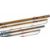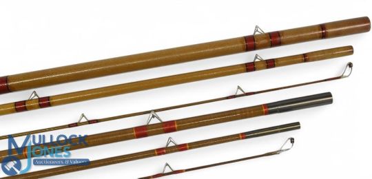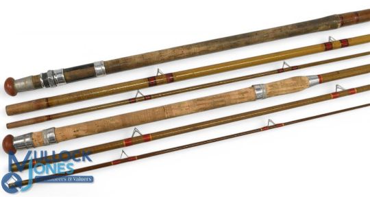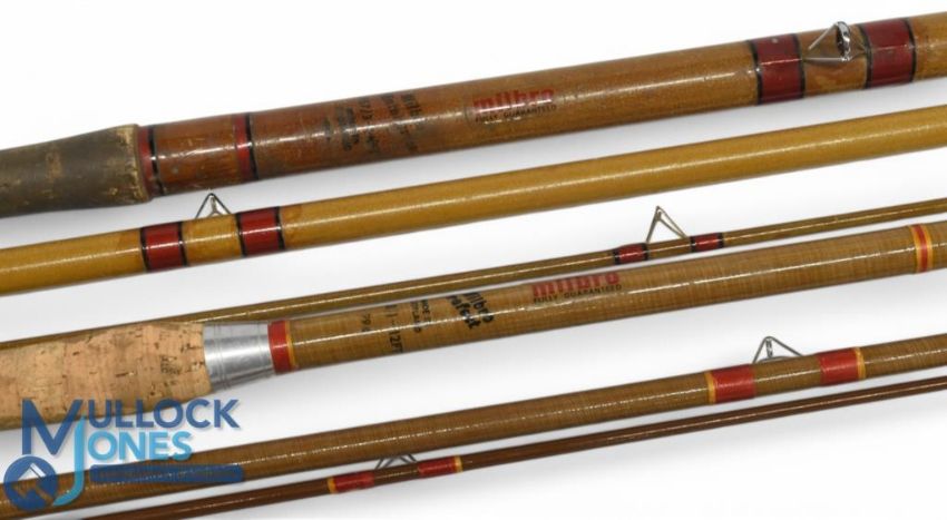 Milbro made in Scotland Perfect hollow glass float rod F58/1, 12ft 3pc, 24" handle with alloy sliding reel fittings and collars, stand off rings, with red agate butt/tip ring, MCB. Light use. Milbro made in Scotland Enterprise hollow glass float rod F57/3, 14 ½" ft 3pc, 27" handle with alloy sliding reel fittings, stand off rings with red agate butt/tip ring. MCB, light use. (2)