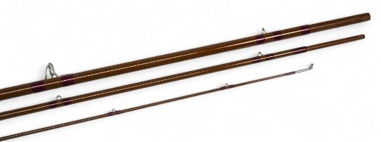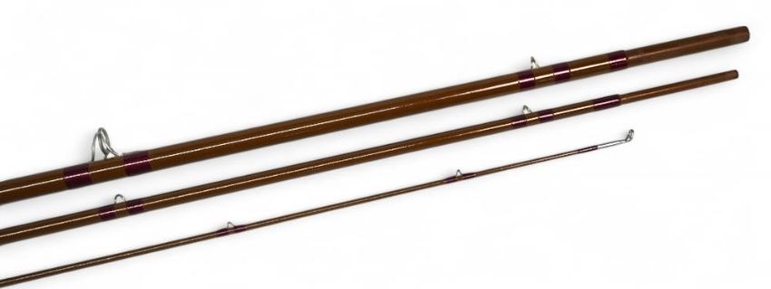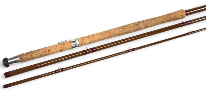 A Farlow & Sharpe "Farlight" hollow glass salmon fly rod, 13ft 3pc line 8/9#, 20" handle with alloy reel fittings, cloth bag. Light use