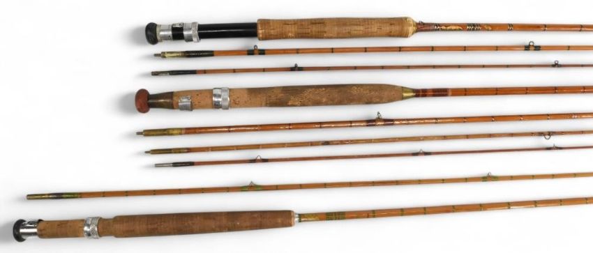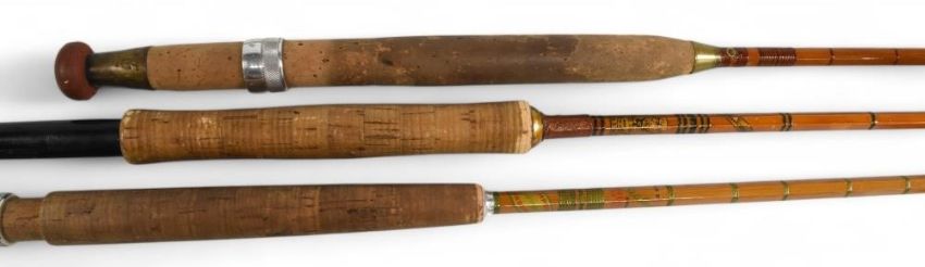 Edgar Sealey "The Brook" split cane fly rod 8ft 6in 2pc alloy sliding reel fitting and collar, agate butt/tip ring, MCB and a Buchan 10ft 3pc split cane rod with spare tip, butt ring missing, tips 2" and 7" short, cloth bag and Modern Arms elasticane trout fly rod 8ft 6in 3pc alloy sliding reel fittings, lined butt/tip ring, cloth bag (3)