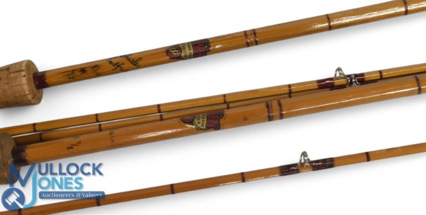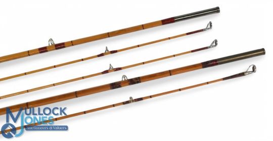 Sydney Jarvis Redditch split cane trout fly rod 8ft 6" 2pc line 6/7# with spare tip section, alloy uplocking reel seat, red agate butt/tip rings, Allcocks cloth bag, light use. Sydney Jarvis split cane trout fly rod 9ft 2pc line 7/8#, alloy down locking reel seat, red agate butt/tip rings, no bag. (2)