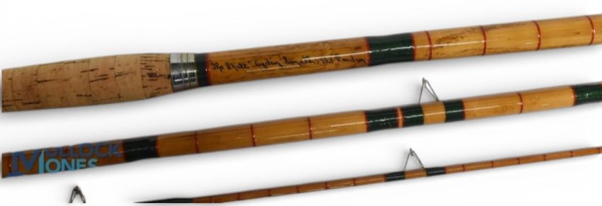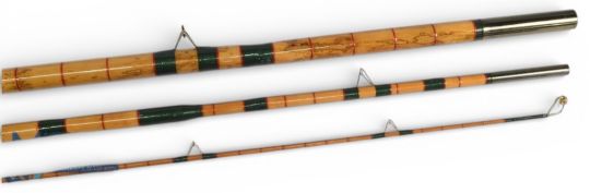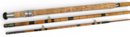 Ogden Smith, London the Chelt 12'6", 3 piece coarse fishing rod, Spanish reed butt, whole cane stepped middle and top with split cane spliced tip, whipped green, tipped red, bronze ferrules, 22" cork handle with alloy reel fittings, fully restored, no bag