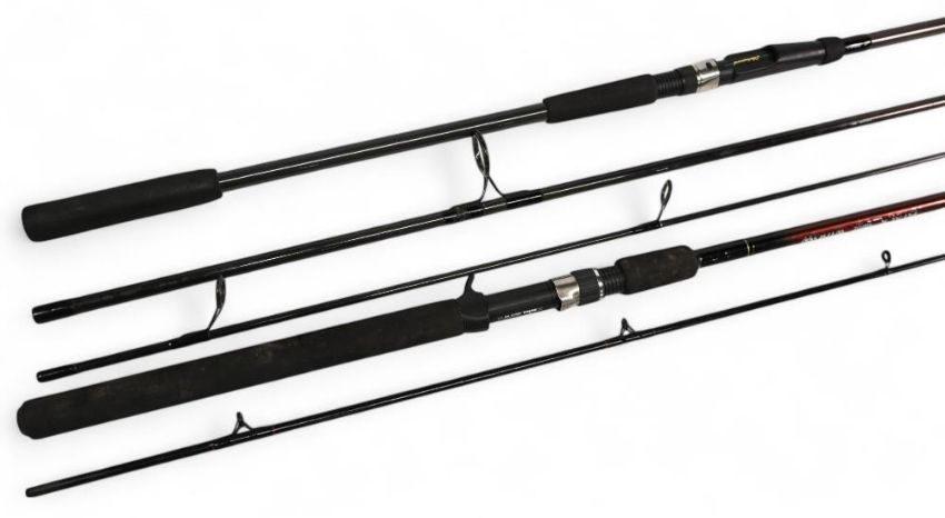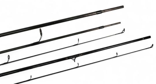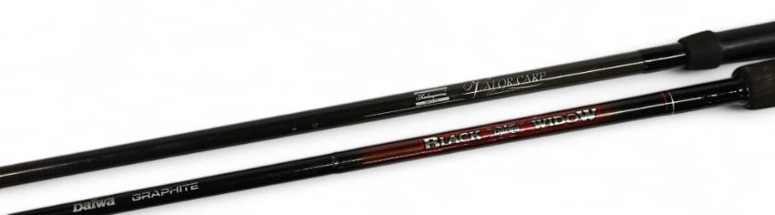 Daiwa Graphite Black Widow carbon spinning rod 8ft 6" 2pc, CW 3/8 - 3/4 oz, medium action, 20" handle, down locking reel seat, lined rings, cloth bag. Shakespeare Valor carp carbon rod, 3.6m 3pc, 1809.250 TC, 2.5 lb, twin composite grips, uplocking reel seat, lined stand off rings, cloth bag. (2)