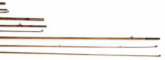 W Hamlin Maker Cheltenham split cane trout fly rod, 9ft 3" 2pc with spare tip, brass sliding reel seat and collar, red agate butt/tip rings, cloth bag, very light use. Hexacane Deluxe Made in England, split cane trout fly rod, 9ft 3pc, brass reel fitting and collars, red agate tip ring, Daiwa cloth bag, light use. Modern Man Elasticane Vesta brook split cane trout fly rod, 7ft 6" 3pc alloy sliding reel fitting, clear agate tip ring, cloth bag, light use. (3)