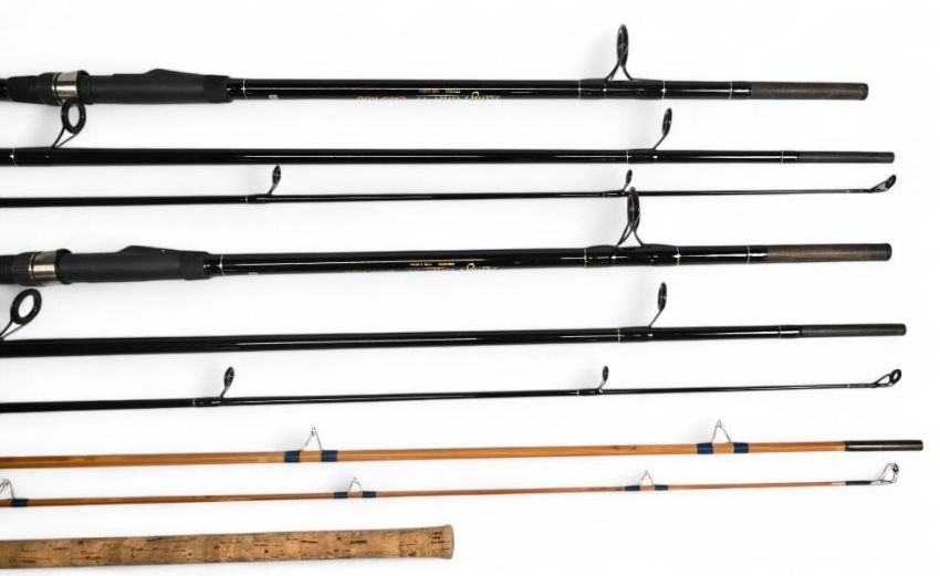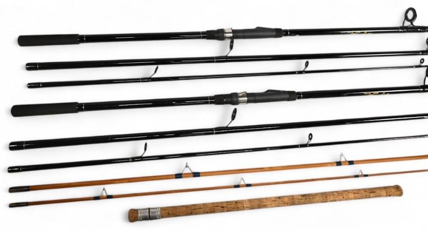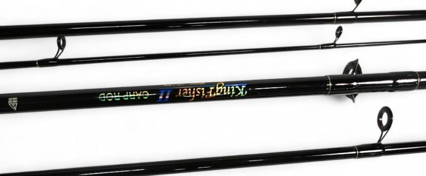 Pair of Kingfisher MK II FR1933 carbon carp rods 12ft 3pc with composite grips, uplocking reel seat, lined rings throughout, both with MCBs - light use, and an unnamed split cane carp rod 10ft 3pc incl detachable handle, lined butt/tip ring, cloth bag, light use (3)