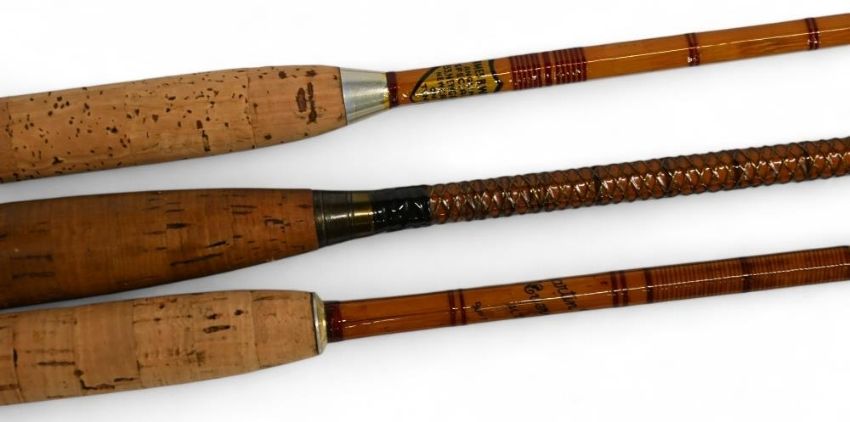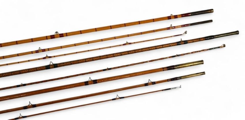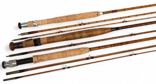 James B Walker Newcastle on Tyne split cane trout fly rod, 9ft 6" 3pc alloy reel fitting and collar, red agate butt/tip rings, MCB. Looks very original, light use. Martin James Redditch "Everyman" split cane trout fly rod, 9ft 6" 3pc (tip 7" short), alloy uplocking reel seat, cloth bag. Fosters Maker Ashbourne split cane trout fly rod with diamond mesh sheath, 10ft 6" 2pc, lined tip ring stud lock joint and cloth bag. (3)