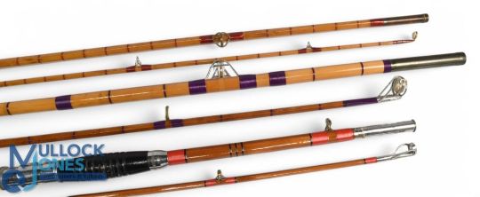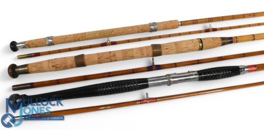 Sealey Octopus "The Craster" split cane light boat rod, 8ft 2pc, alloy sliding reel fittings and collars, lined butt/tip rings, cloth bag, light use. Unnamed heavy boat rod, whole cane butt, split cane tip, 8ft 2pc, brass reel fittings and collars, lined rings, cloth bag, light use. Unnamed heavy boat rod, split cane, 6ft 2pc, 24" turned wood handle, alloy uplocking reel seat, lined rings, cloth bag. (3)