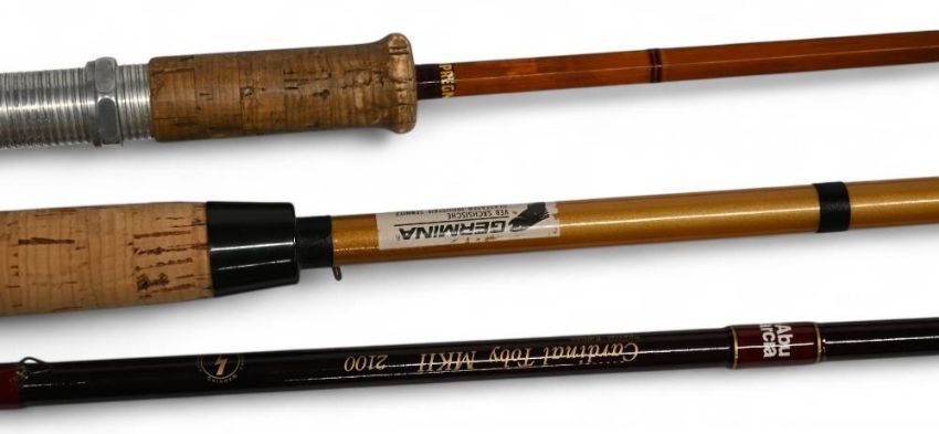 Abu Cardinal Tory Mk II 2100 special edition spinning rod 10ft 2pc, CW to 40g, 24" handle, down locking reel seat, lined stand off rings, MCB, light use. Germina solid glass sea rod, 8ft 2pc, 24" handle with uplocking reel seat, cloth bag. Sharpes of Aberdeen split cane spinning rod No 41-93, 8ft 2pc, 27" handle, alloy down locking reel seat, lined rings, cloth bag, light use. (3)