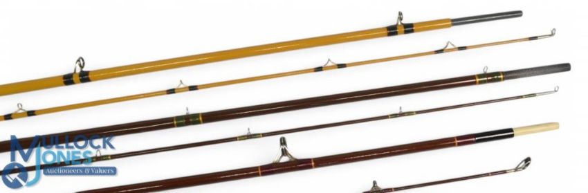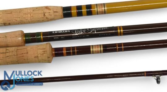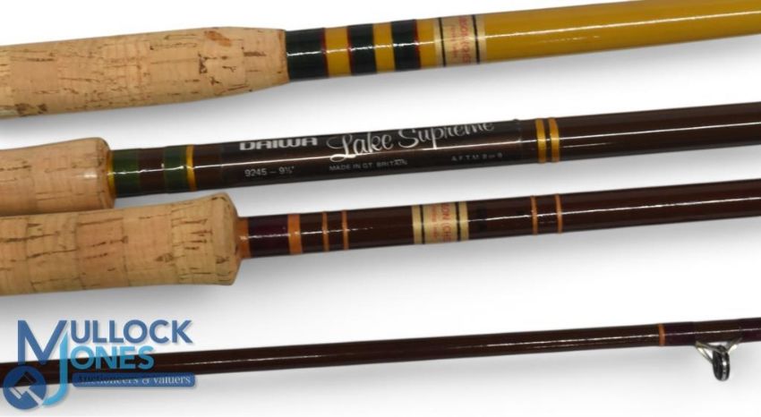 Daiwa "Lake Supreme" hollow glass trout fly rod 9245, 9ft 6" 2pc, line 8/9#, alloy uplocking reel seat, lined butt ring, cloth bag. Very light use, plastic still on handle. D Gibson Chester fibatube trout fly rod, 8ft 2pc line 5/6#, down locking reel seat, lined stripping rings, cloth bag. Light use. D Gibson fibatube medium spinning rod, 8ft 2pc, 21" handle, down locking alloy reel seat, lined rings throughout, cloth bag, very light use. (3)