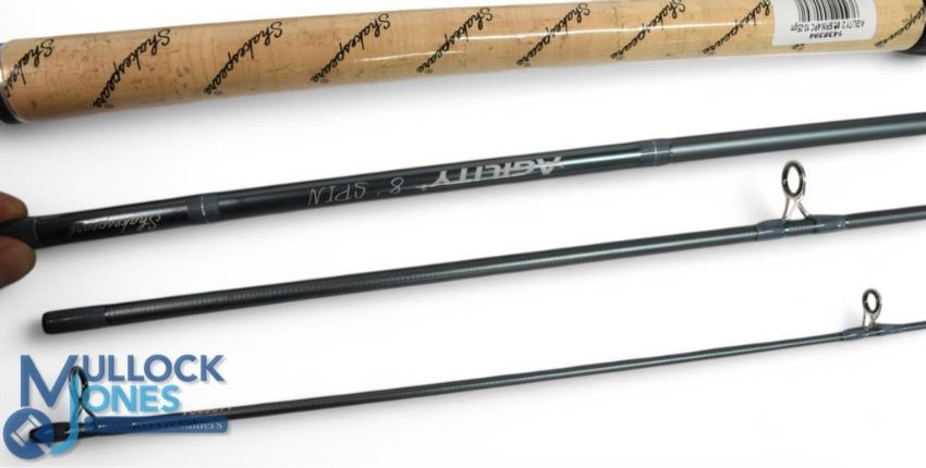 Shakespeare Agility 2 carbon spinning rod, 8ft 4pc, line 8lb, CW 10/25g, 20" handle with uplocking reel seat, lined rings throughout, sectioned Cordura tube. Looks unused, plastic still on handle. Unnamed 5ft carbon spinning rod, 7" handle with alloy sliding reel fittings. Tidy. (2)