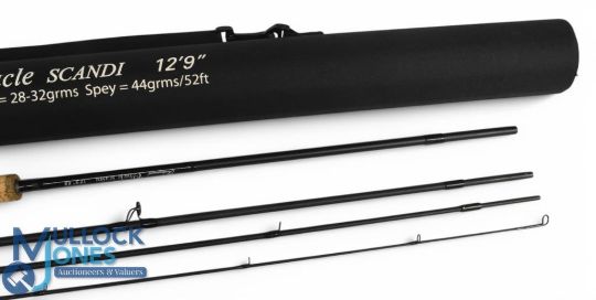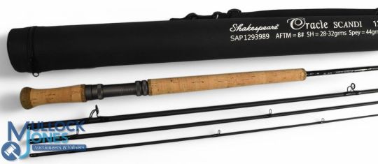 Shakespeare Oracle Scandi carbon salmon fly rod 12ft 9" 4pc line 8#, 21" handle, alloy double down locking reel seat and collar, lined stripping rings, Cordura tube. Very light use