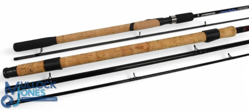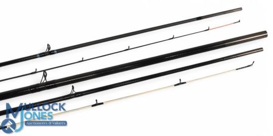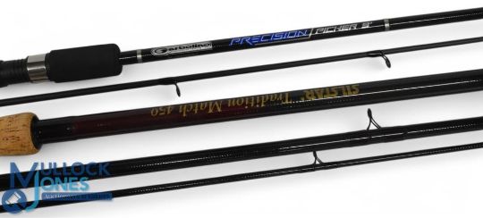 Garbolino Precision Picker carbon rod, 9ft 2pc, 10/35g, line 2-6lb, 17" handle with down locking reel seat, lined rings throughout, MCB. Very light use. Silstar Traditional Match 450 carbon rod, 15ft 3pc, action A20, 24" handle with composite sliding reel fittings, lined rings throughout, MCB. Very light use. (2)