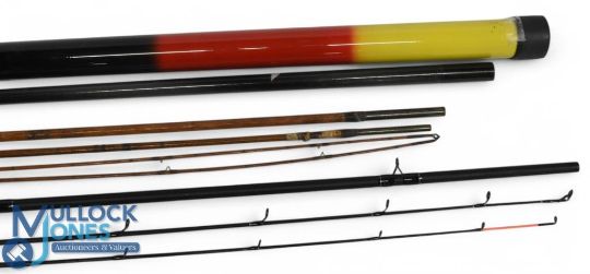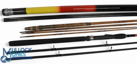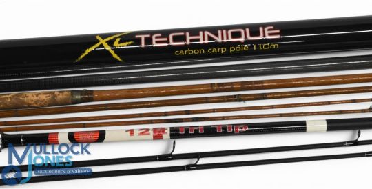 Mitsuroshi Tri Tip carbon rod, 12ft 2pc with 2 spare tips, 24" handle, uplocking reel seat, lined stand off rings, original plastic bag (note butt ring missing liner). XL Technique carbon carp pole - 11m. Unnamed whole cane 11ft 3pc greenheart rod with spare tip - for restoration. (3)