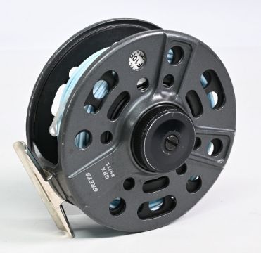 Greys GRX 9/11 alloy cassette salmon fly reel with 4x spare cassettes, 4 ¼” wide perforated spool and frame, 2 screw latch, counter balanced handle, large rear spindle tensioner. Light rim wear, runs okay