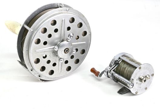 Pflueger Akron multiplier reel No 18941, twin waisted handles, on/off check, runs well. In wood box. Pflueger Pakron large centre pin reel No 3178m 5 ½” perforated spool, ‘T’ shape counter balanced handle, on/off check, large rear spindle tensioner, runs okay. (2)