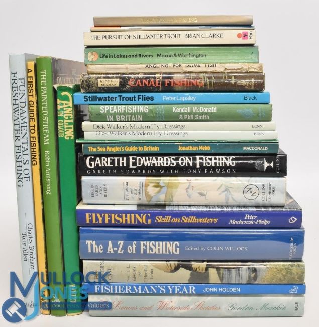 Twenty-three Fishing Book & Publications - Practical Fly Fishing 1970 Arundo, Anglers' Guide to Lancashire 1987 James Holgate, The Pursuit of Stillwater Trout 1978 Brian Clarke, Life in Lakes And Rivers 1972 T T Macan & E B Worthington, Angling for Game Fish 1957 John Bickerdyke, Canal Fishing 1971 Kenneth Seaman, The Bankside Book of Stillwater Trout Flies 1983 Peter Lapsley, Spearfishing in Britain 1963 Kendall Mc Donald, Dick Walker's Modern Fly Dressings 1980 x2, Cairns Game Fishing Club Official Magazine April 1987, The Sea Angler's Guide to Britain - Where to Go 1975 Jonathan Webb, Gareth Edwards of Fishing 1984 Tony Pawson, Life in Lakes and Rivers 1990 T T Macan & E B Worthington, Flyfishing Skill on Stillwaters 1986 Peter Mackensie-Philps, The A-Z of Fishing 1992 Colin Willock, The Angler's Cast 1960 T L Edwards & E Horsfall Turner, The How, When & Where of Britain's Best Fishing Fisherman's Year 1991 John Holden, Fly Leaves and Waterside Sketches 1998 Gordon Mackie, Sea, Coarse and Game Angling in Colour 1980 Alan Wrangles, The Painted Stream A River Warden's Life 1985 Robin Armstrong, A First Guide to Fishing c1978 Stan Piecha, Fundamentals of Freshwater Fishing 1999 Charles Bingham & Tony Allen, most in good condition