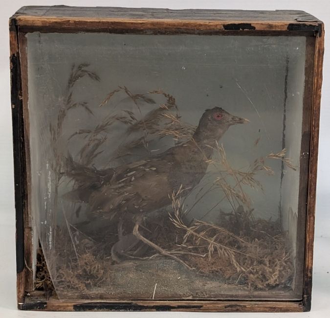 Taxidermy small period Corncrake, in wooden case, with Perspex front (with damage) 20cm x 20cm
